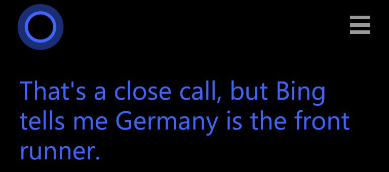 این در حالی بود که Cortana بازی آلمان و برزیل را نیز با برد آلمان پیش بینی کرد و در حالی که بسیاری در این موضوع و توان آلمان برای برد میزبان بازیها شک و تردید داشتند، Cortana رأی خود را صادر کرد.